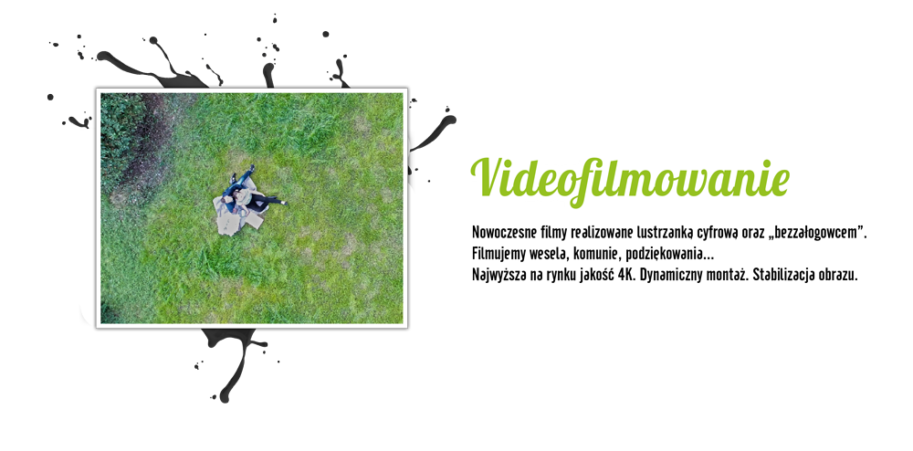 W związku z ciągłym rozwojem, w ofercie posiadamy również usługę wideofilmowania. Nasze filmy realizujemy za pomocą lustrzanki cyfrowej, bezzałogowego statku powietrznego, w technologii 4K.